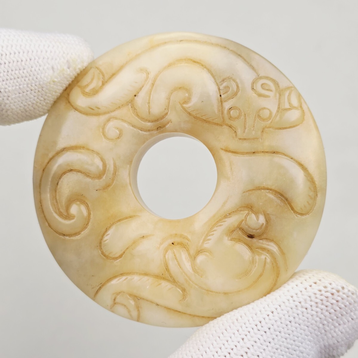 - 中国骨董 本物和田白玉 土黄沁 両面浮彫 戦漢穿龍紋 玉璧 根付 玉佩 激安