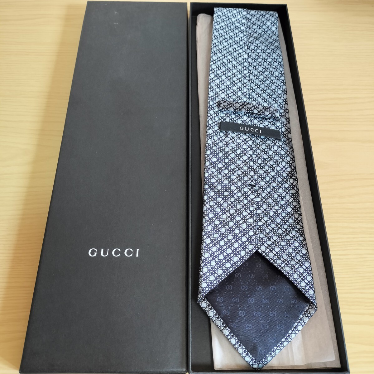 - グッチ(GUCCI)紺色シルバー四つ葉Gロゴ模様ネクタイ