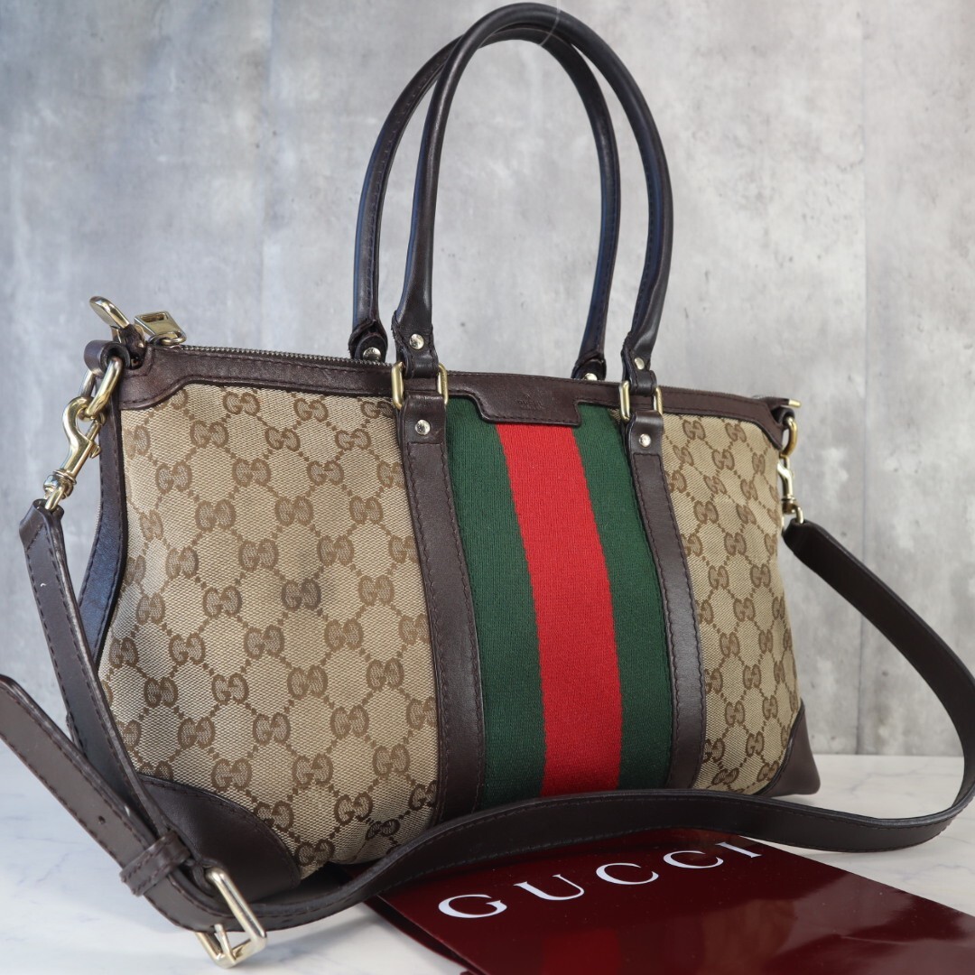 - GUCCI グッチ ミニボストンバッグ ハンドバッグ 2way 斜め掛け ショルダー シェリーライン GGキャンバス レザー 本革 茶 ブラウン ビジネス