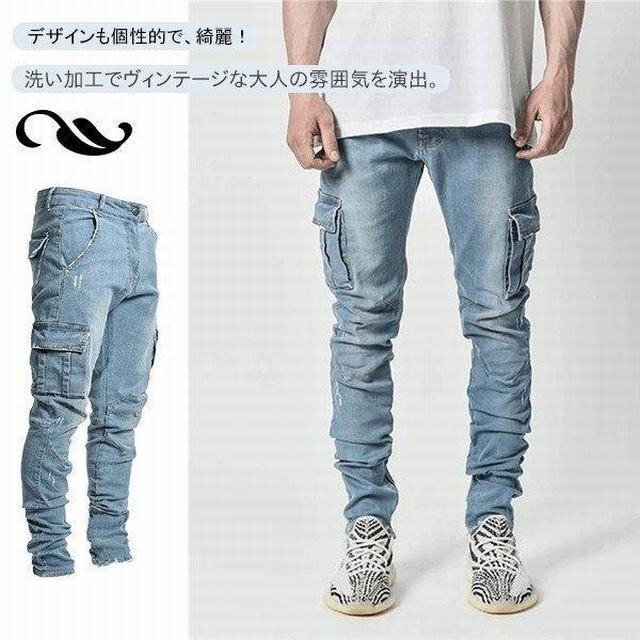 - 秋 ジーパン ジーンズ カーゴパンツ デニムパンツ メンズ スキニーデニム 作業着 パンツ ワークデニム ブルー XL