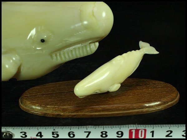 - 【金閣】抹香鯨 歯 細密 彫刻 鯨 置物 根付 台付 旧家蔵出 送料無料(A995)