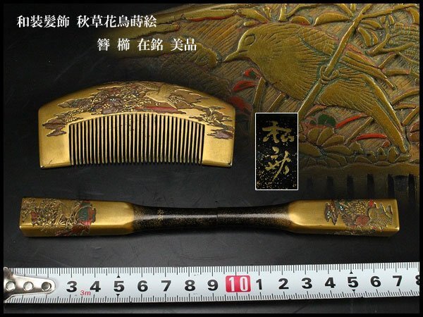 - 【金閣】和装髪飾 秋草花鳥蒔絵 簪 櫛 在銘 旧家蔵出 送料無料(MG933)