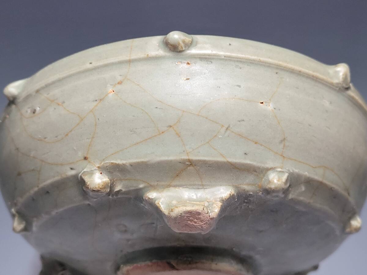 > ● 幅 約 12cm 太鼓の形で製作された姿と内部の陰刻の花文が美しい 時代唐物 青磁 陰刻花文 太鼓型 三足 香炉・宋元時代 薫香 香道具 ●