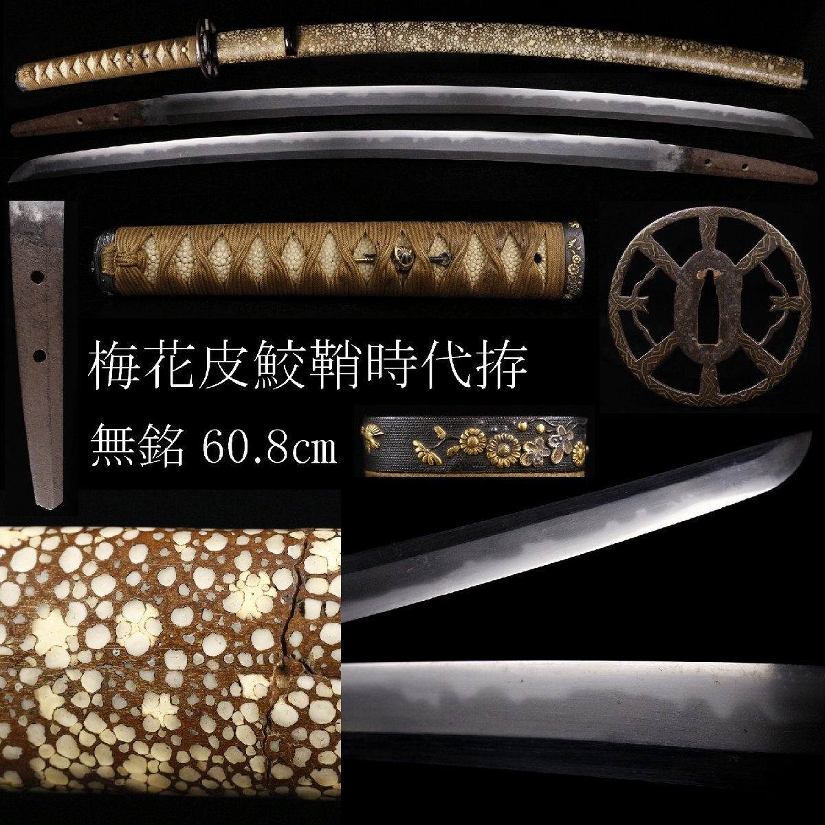 - 【LIG】梅花皮鮫鞘 鮫皮巻柄 時代拵 鉄地平安城象嵌鍔 無銘 60.8㎝ 乱刃 明るい刀身 時代刀剣 [.II]25.11