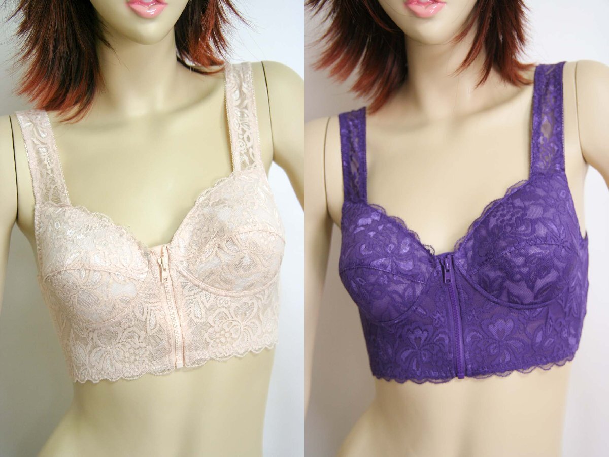 > 送料無料◆2色組◆花柄レース◆前開き綿混ブラジャー(4L/ベージュ&パープル)◆綿95%◆セミロング◆立体カップ◆ノンワイヤー◆背筋きれい