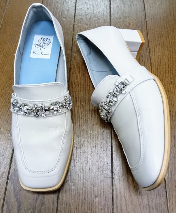 > Emma Francis☆ガラスビジュー付き 4cmヒールローファー 24.5 アイボリースムース 参考価格:13,970円 エマフランシス 靴