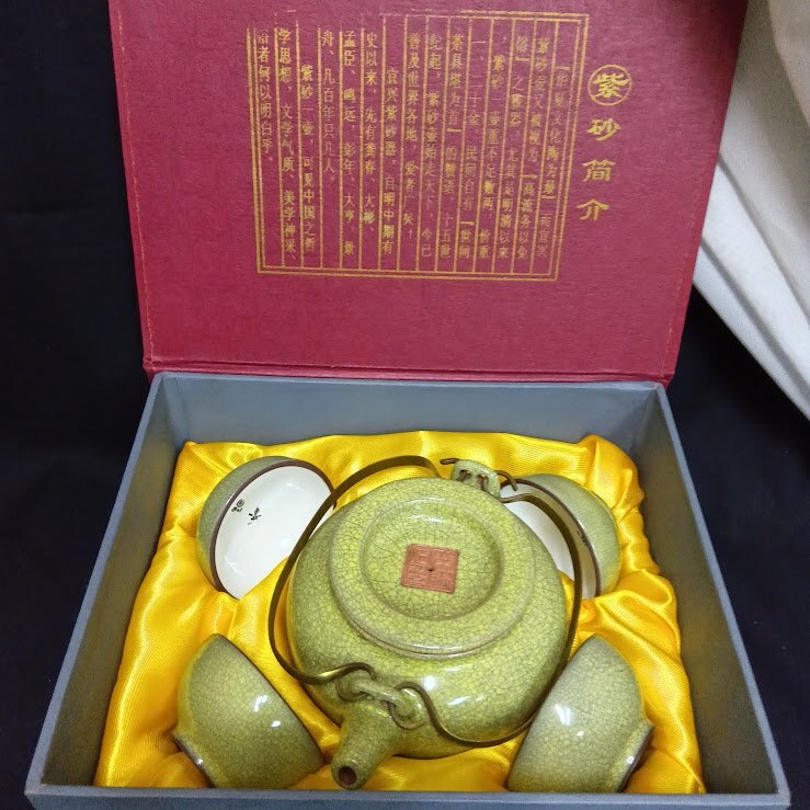> 中国 宜興(YI XING)☆紫砂 茶器セット 急須 茶杯4客 箱入り 茶道具 ヴィンテージ 骨董 中国古玩 唐物 煎茶道具 楽錦石製 在印 時代物 貫入