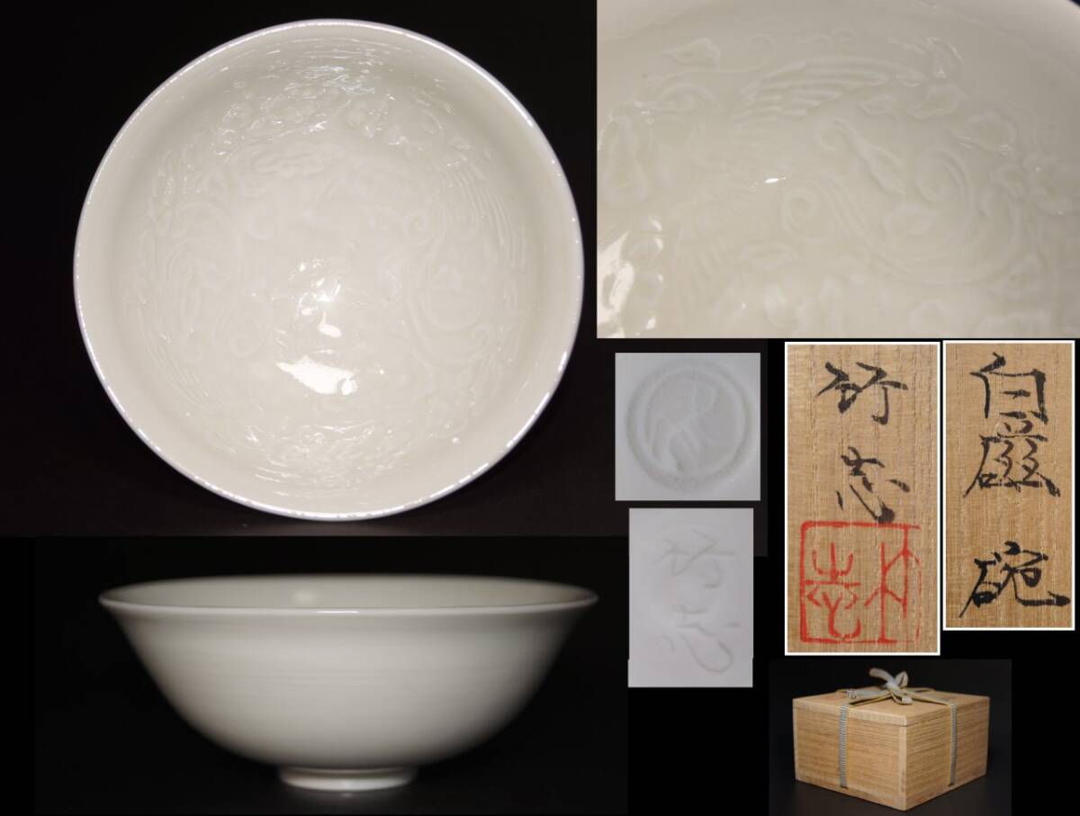 - 真贋保証■川瀬竹志 作■ 白磁 陽刻 鳳凰花唐草文 碗 共箱・共布 茶碗 茶道具 茶器 茶会 茶事 検:中国美術