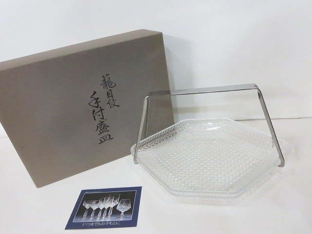 - HOYAクリスタル [保谷クリスタル] 龍目紋 手付盛皿 NDS411T 把手付 食器 大皿 六角形 インテリア ガラス食器 昭和レトロ /未使用品 V6.0
