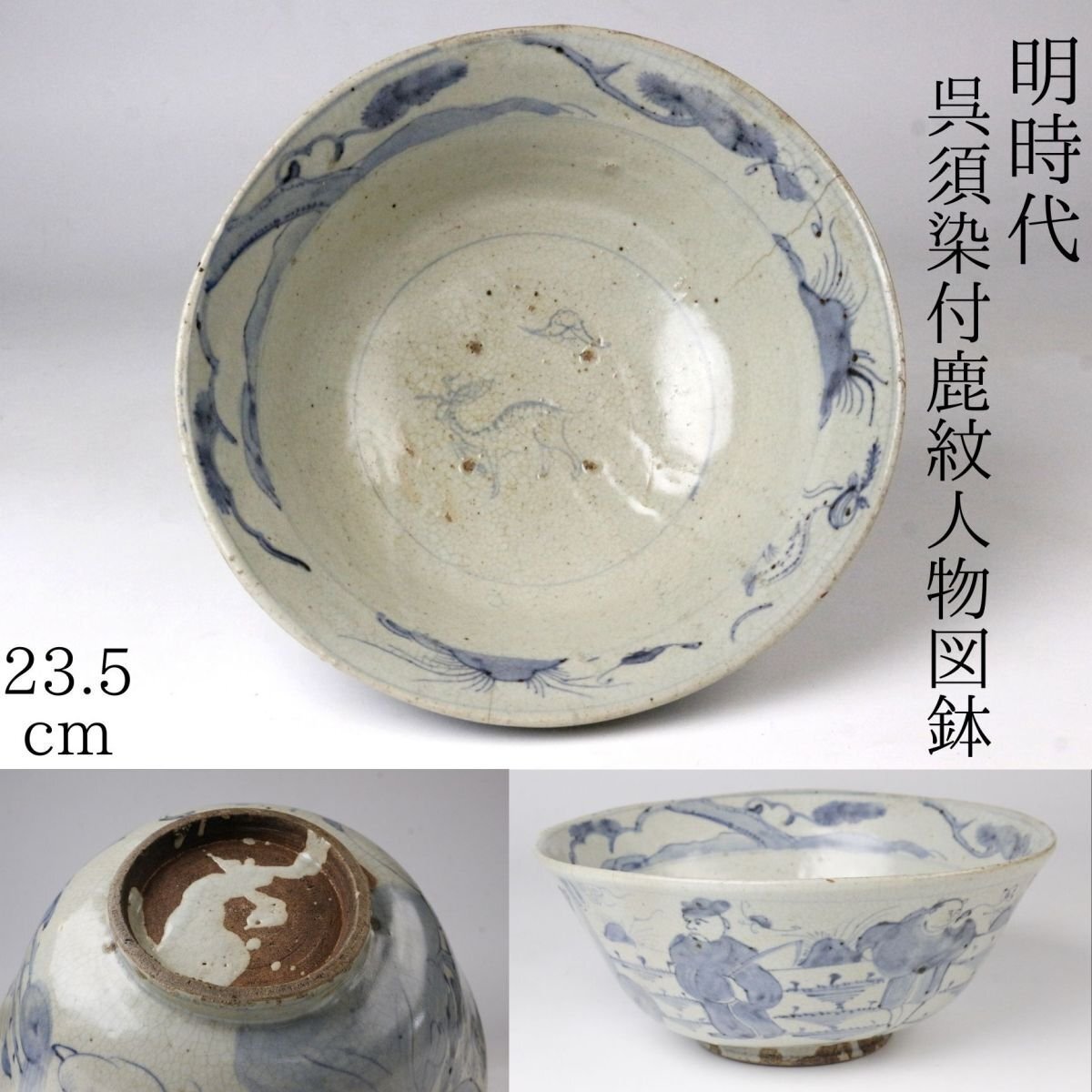 > 【LIG】中国美術 明時代 呉須染付鹿紋人物図鉢 23.5cm 箱付 中国古玩[.QR]25.02