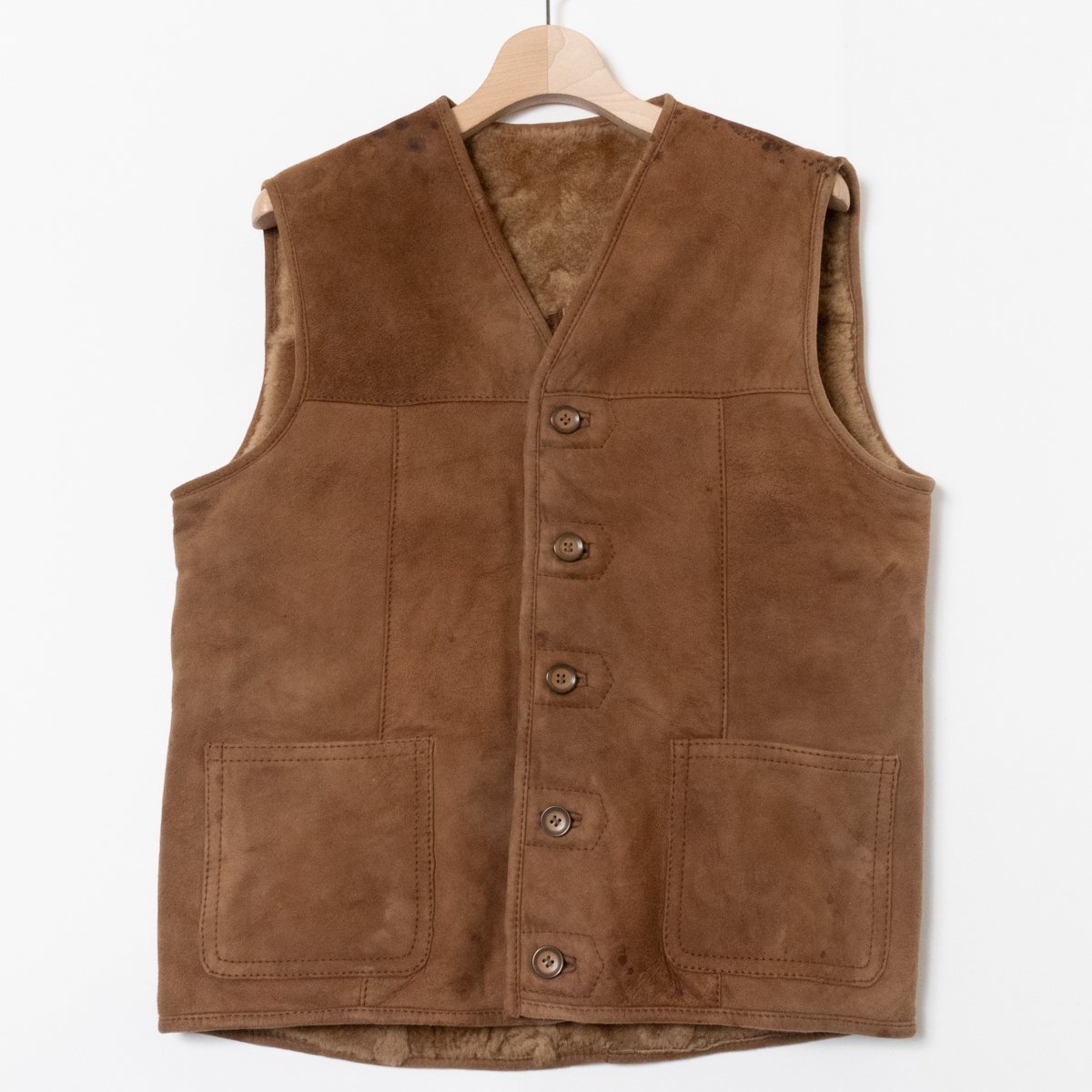 - SHEARING ムートンベスト 羊革 本革 リアルレザー Mサイズ ヴィンテージ ブラウン系 ボタン 重ね着 カジュアル 防寒 秋冬 紳士 メンズ
