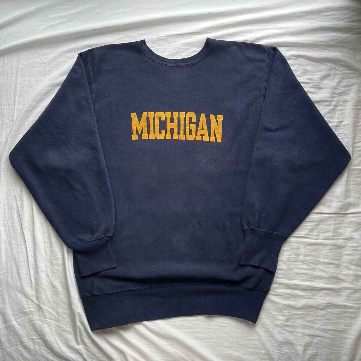 > 【レア ナス紺 ミシガン大学 USA製 90s 刺繍タグ】Champion チャンピオン リバースウィーブ/ビンテージ 単色 ランタグ トリコタグ 50s 80s