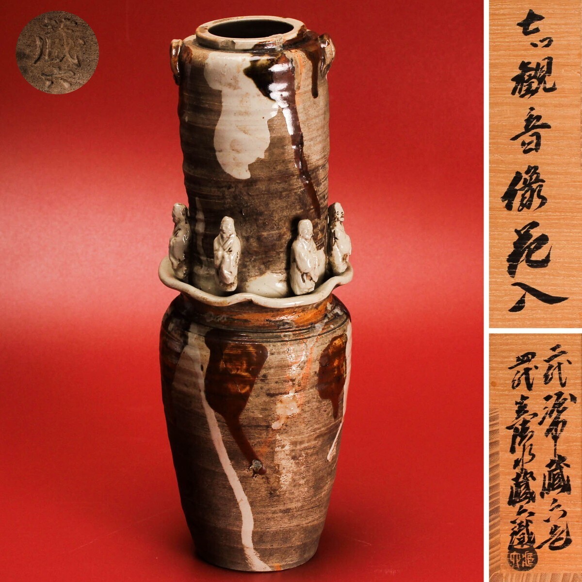 - 二代 真清水蔵六 七つ観音像花入 四代 真清水蔵六識箱 共布 栞 本物保証