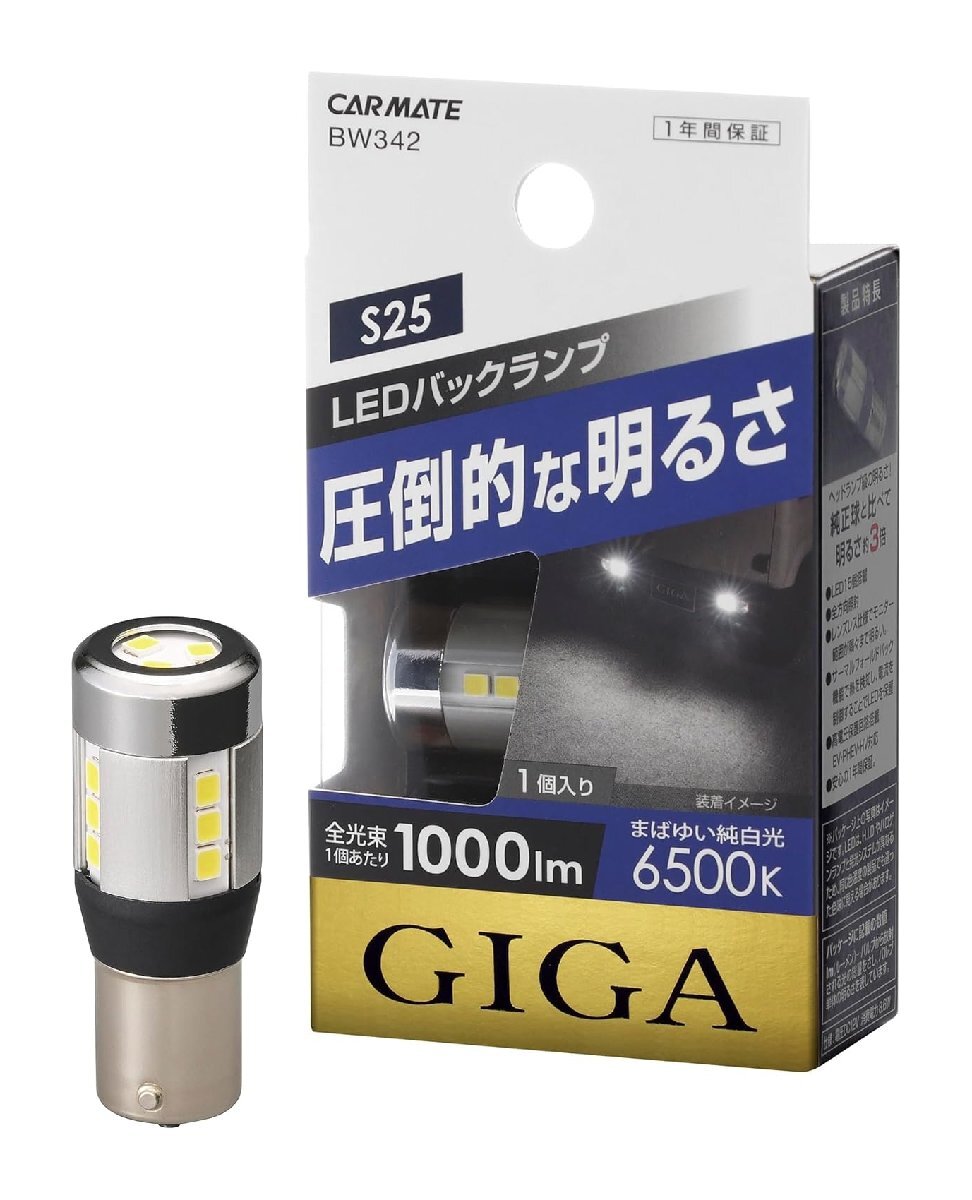 ■メーカー: カーメイト(CARMATE) ■商品名: 車用 LED バックランプ GIGA S25 シングル クリア球 6500K 1000lm 純白光 車検対応 1個入り ■型 番: BW342 ■状 態: 未使用 ■定 価: ------------------------------------------------------------ 商品特徴 : ・目視でもバックモニターでも見やすくなるバックランプ用LEDバルブ。 ・高輝度LEDを15個搭載し、ヘッドランプにも匹敵する全光束1000ルーメンの明るさ。 ・レンズレス仕様にすることでバックモニターに映る範囲を明るく照射。 ・サーマルフォールドバック機能・高電圧保護回搭載でLEDを保護。