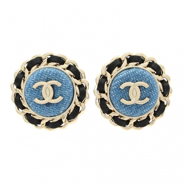 - シャネル CHANEL ピアス ココマーク レザー ゴールド×ライトブルー×黒 B25P 美品 アクセサリー(耳)