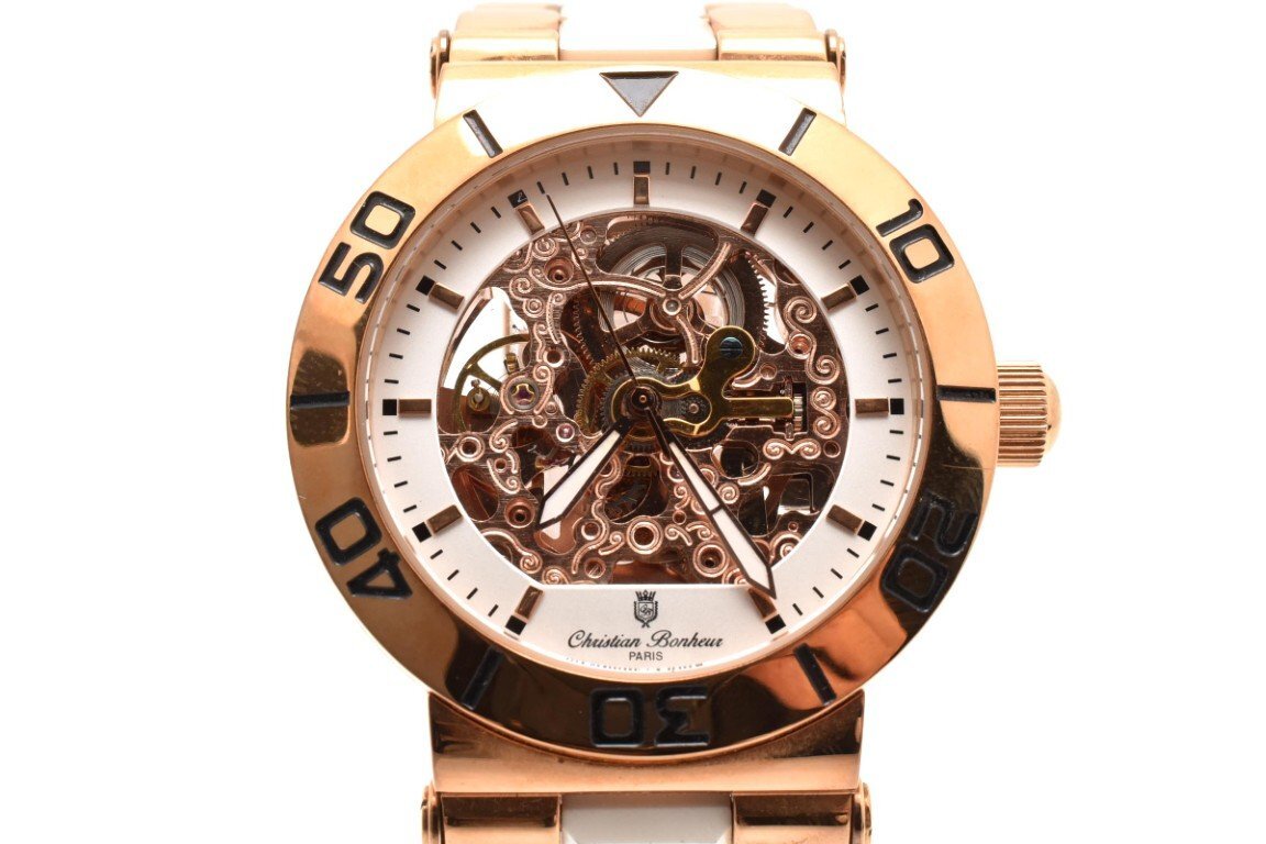- 稼働品 クリスチャンボヌール CB-9003 自動巻き ローズゴールド ホワイト スケルトン 3針 SS メンズ 腕時計 CHRISTIAN BONHEUR