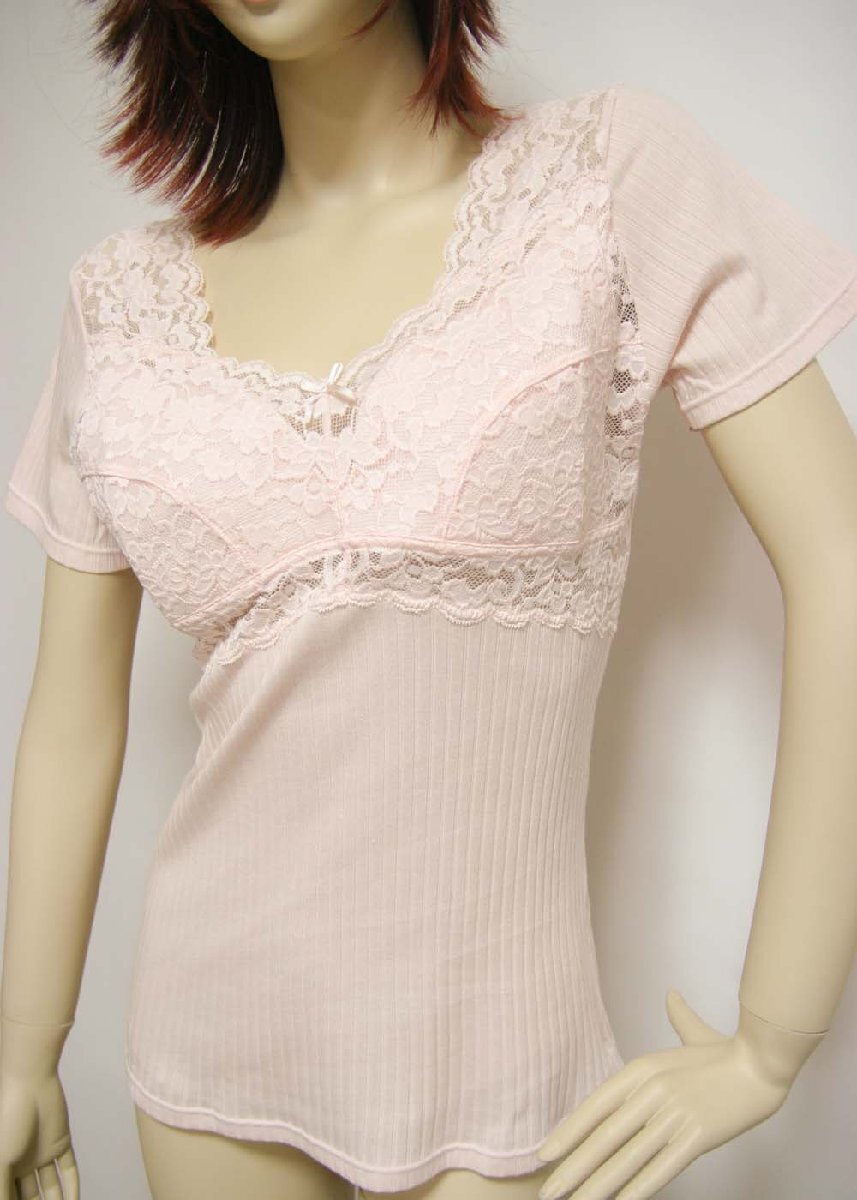 > 送料無料◆綿100%◆さらっと快適◆爽やかな肌触り◆伸縮性抜群◆針抜き編み◆ソフトブラカップ付き◆らくらく3分袖インナー(L/ピンク)