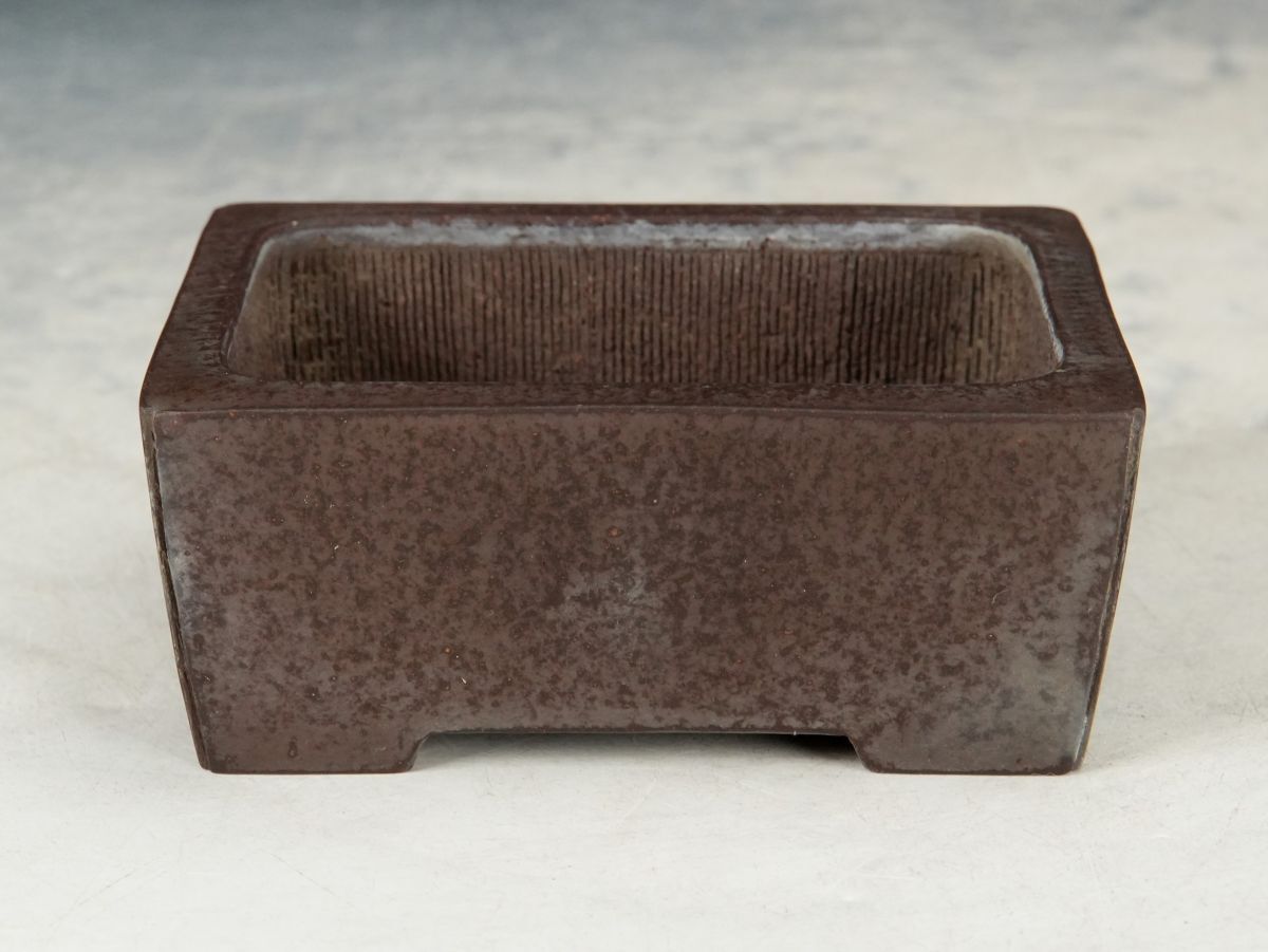 - 【ISBS】人気和鉢作家 橘充信作「充信紫泥切立隅入り切足長方鉢」釘落款 泥味最高 抜群の成形 間口約9.8cm[Y2025112702]