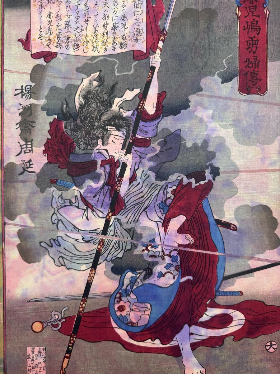 - 【真作】本物浮世絵木版画 楊洲周延「鹿児島勇婦伝 多間仁志須女」明治期 美人図 武者絵 錦絵 大判 保存良い