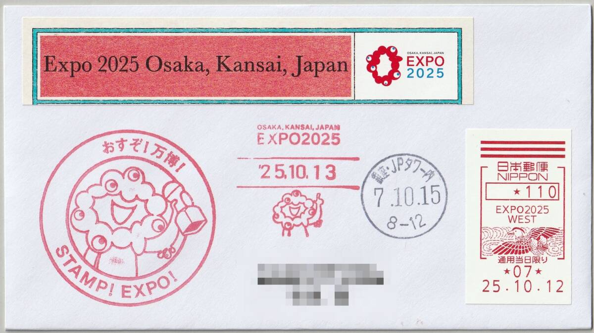 > 2025年 日本国際博覧会(2025大阪・関西万博)を記録するカバー【郵便証紙】EXPO2025 WEST郵便局/会場スタンプ押/令和7年10月12日