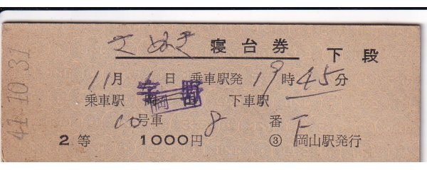 - 鉄道切符 硬券 さぬき 寝台券(2等) 宇野から 岡山駅発行