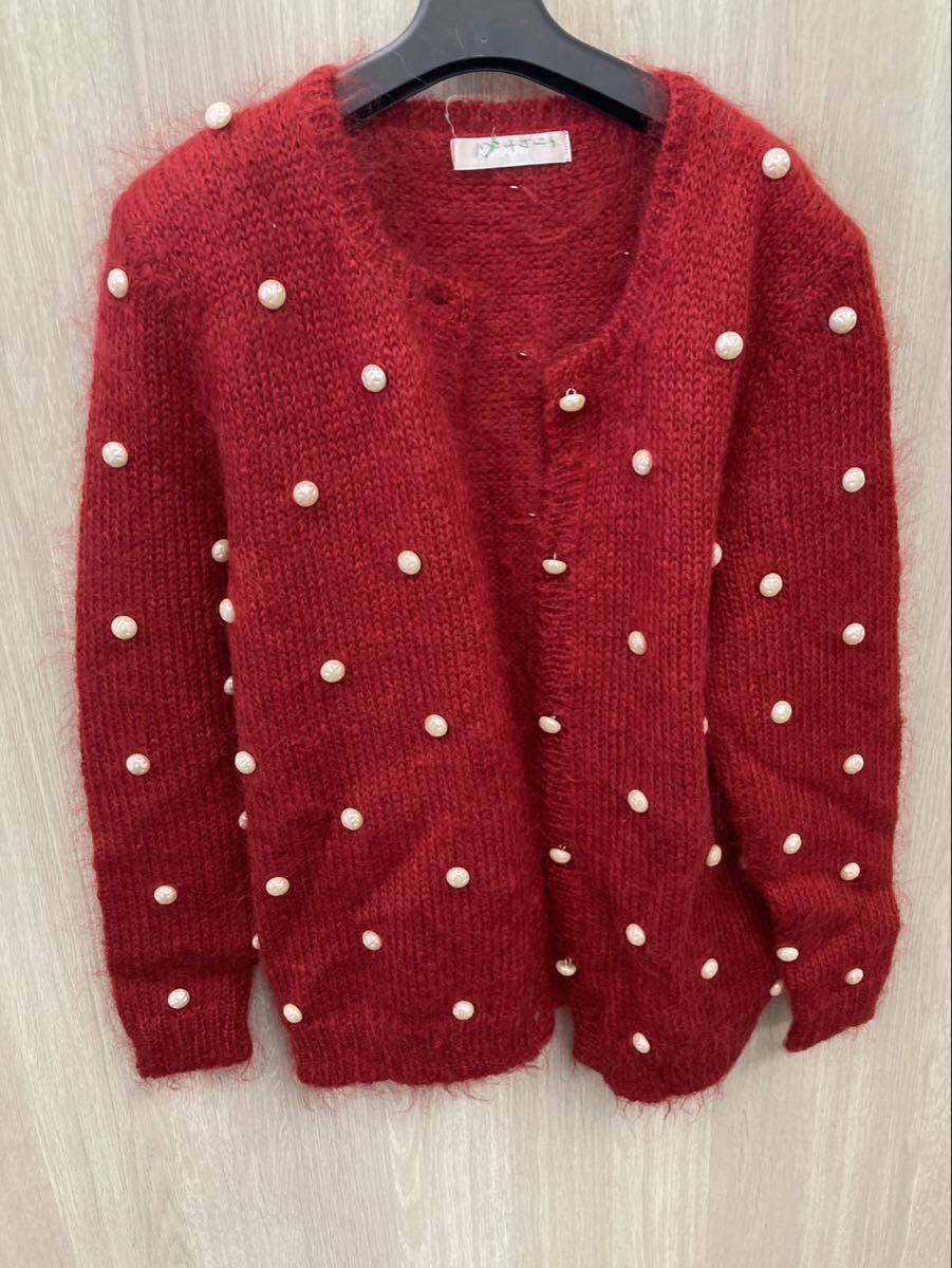 > 【希少・人気】モヘア混 パール装飾 カーディガン 赤 レッド ニット 羽織り レディース 毛100% モヘア