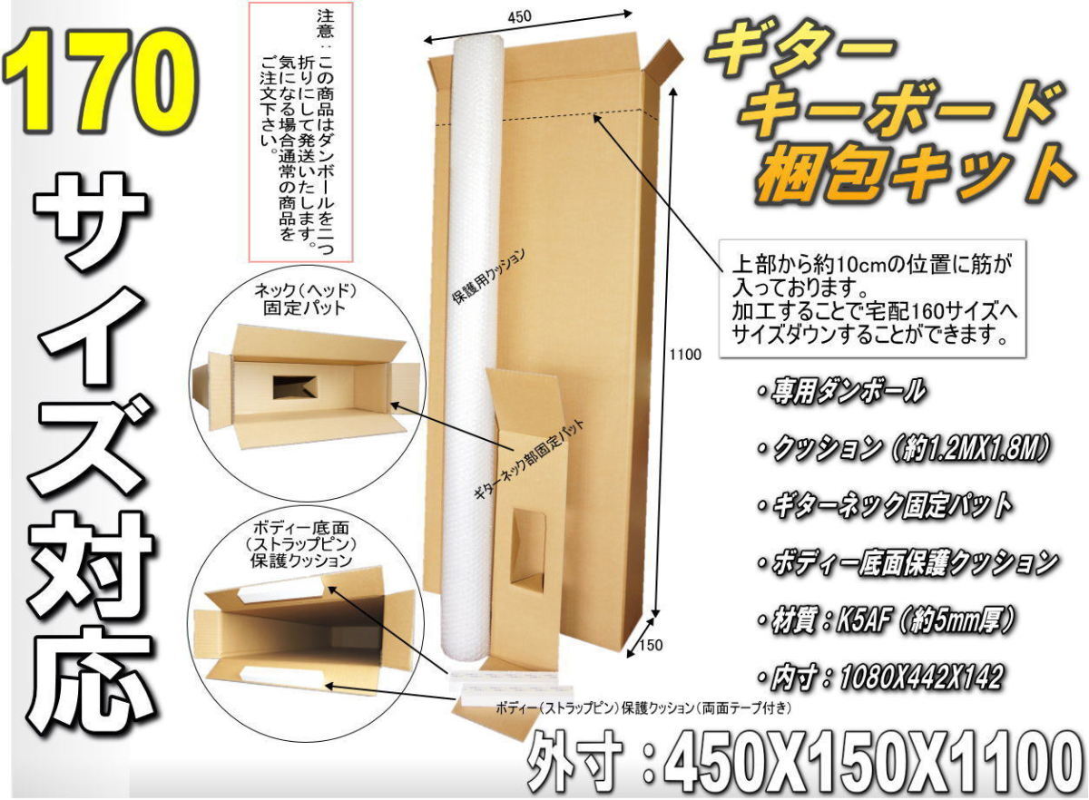 - ギター梱包用ダンボールとネック固定パットボディーエンド部保護クッション保護エアクッションの梱包セット(段ボール二つ折り)