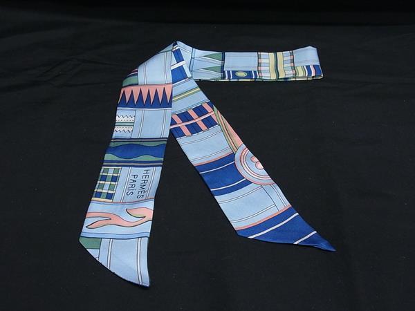 - 1円 ■美品■ HERMES エルメス Voltes et Pirouettes【ヴォルト エ ピルエット】ツイリー シルク リボンスカーフ ライトブルー系 FN8485