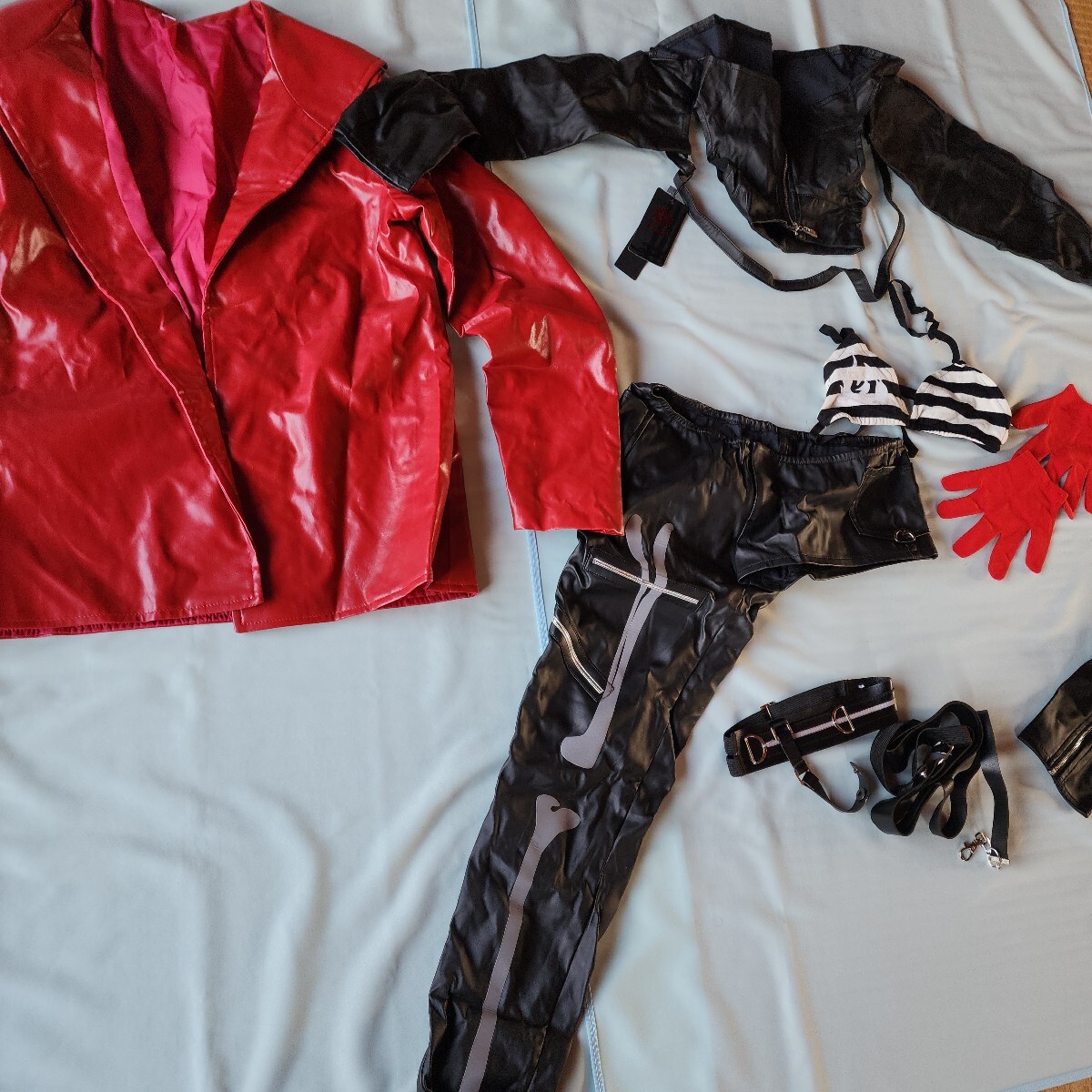 > FGOジャンヌダルク 革のジャケットはワインレッドに近いです 黒い革の衣装 黒とグレーのアクセサリーパーツ 赤と白と黒のパーツ