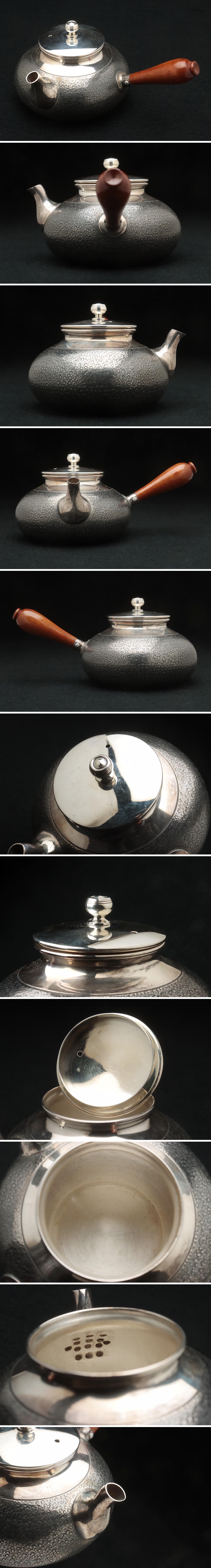 > EZ031 時代金工 銀製 砲口 鎚目肌 木彫横手 銀急須 幅9.2cm 重96g 木箱附・銀急須・茶注 大正 煎茶道具 銀茶器