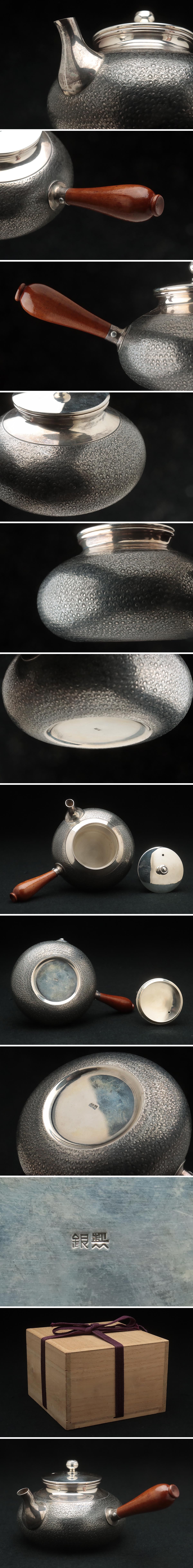 - EZ031 時代金工 銀製 砲口 鎚目肌 木彫横手 銀急須 幅9.2cm 重96g 木箱附・銀急須・茶注 大正 煎茶道具 銀茶器