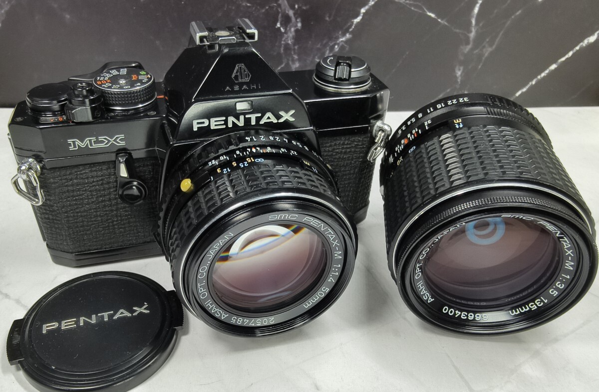 - 【終活】 PENTAX MX 機械式最小一眼+PENTAX-M 50mm f1.4 薄型大口径+135mm f3.5 単焦点2本セット 各動作良好 シャッター快調 露出計OK