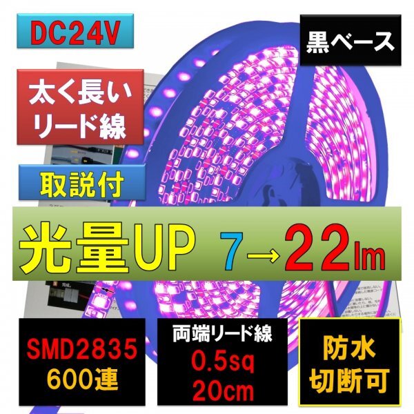 - 高輝度ピカット LEDテープライト 24V 防水 5m 紫 パープル 黒ベース 太くて長いリード線 0.5sq 20cm fa