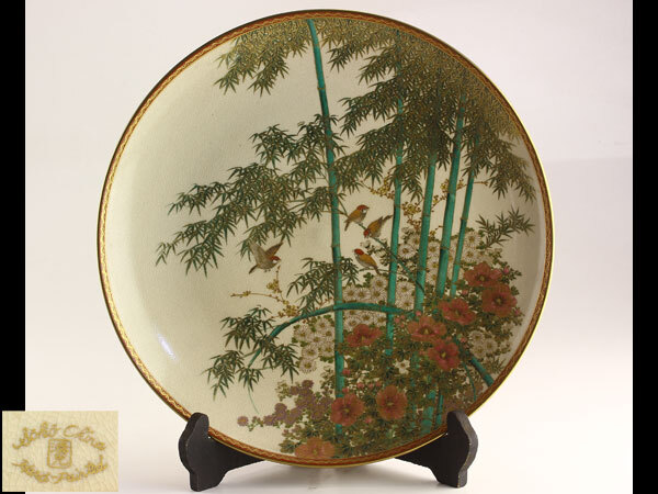 - 日本美術 湊光 薩摩焼 神戸薩摩 竹雀之図 飾皿 径30.5cm C1404