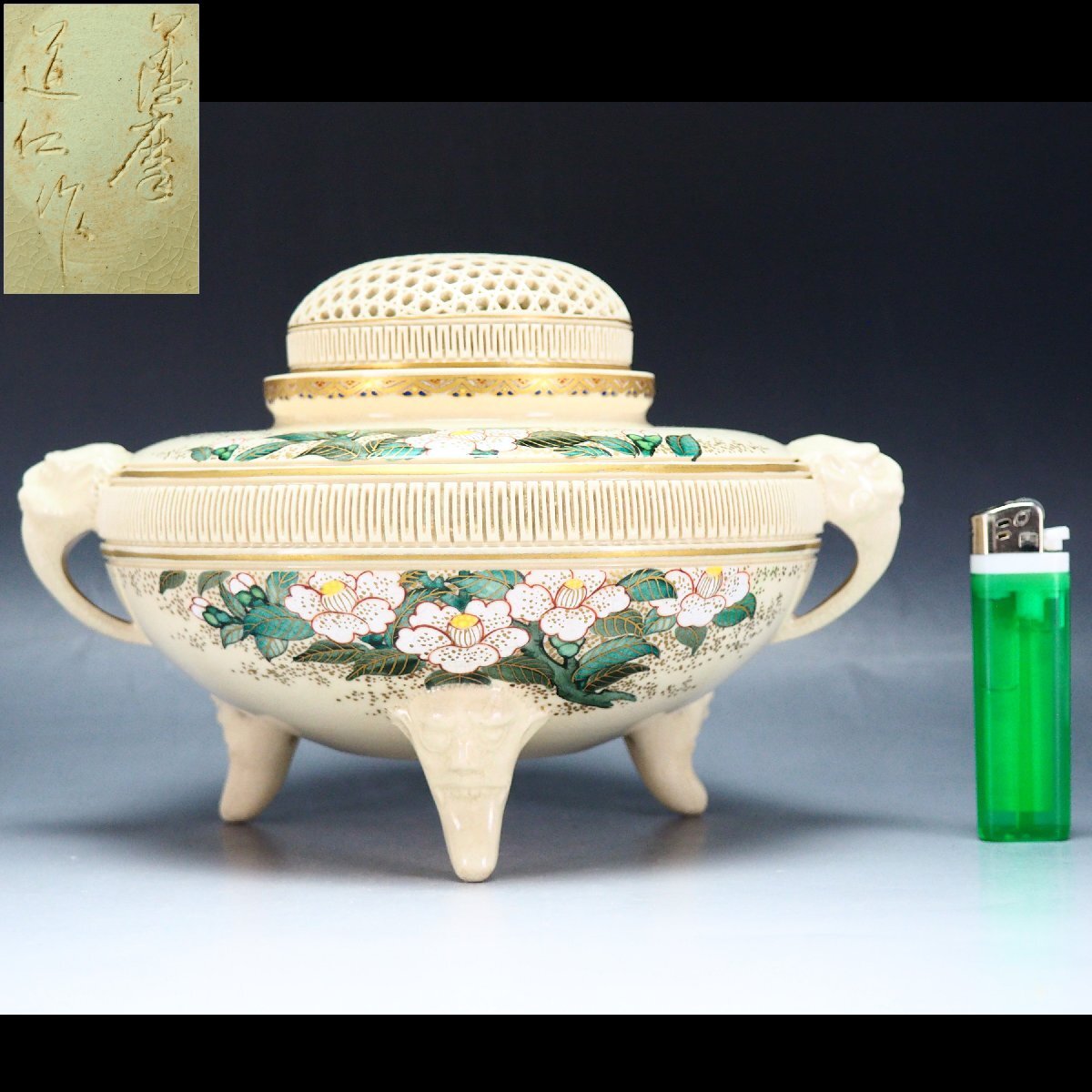 - 【治】薩摩焼 『道仁』作 薩摩金襴手 花紋獅子耳三脚香炉☆幅 22cm 置物 オブジェ (検索:時代 京焼 薩摩焼 九谷焼 香道具) ON48