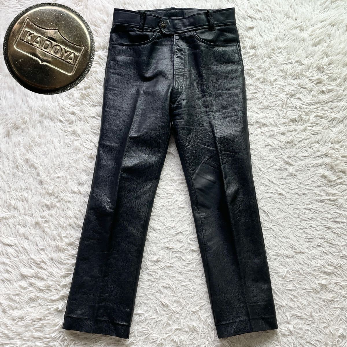 - KADOYA ライティング レザーパンツ シボ加工 ロゴ刻印メタルボタン ジップフライ ブラック メンズ カドヤ バイクウエア 革パン 黒 バイカー