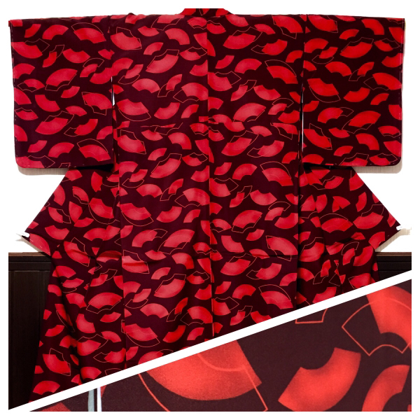 - 【小紋】正絹 袷 身丈157cm 茜色 扇面の小紋 躾有り