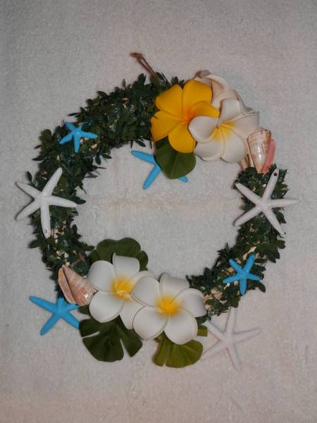 - ハンドメイド ホワイト・ブルー人口海星×プルメリアリース