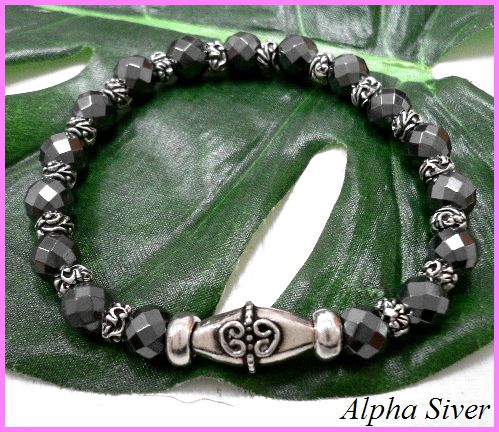 - シルバー925銀パーツ付 8mm珠カット ヘマタイト数珠ブレス/伸縮フリー/ラスト1点