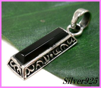 - シルバー925銀の天然石オニキス スティック アラベスク フレーム ペンダント