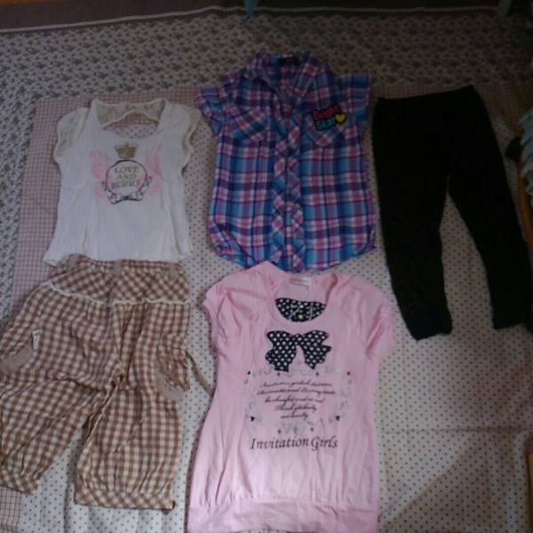 > 中古品!140サイズガールズウェア!Tシャツ2点!スパッツ1点、ズボン1点、ブラウス1点セット