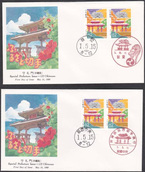 - FDC 1989年 ふるさと切手 守礼門 P貼4消 2種 NCC