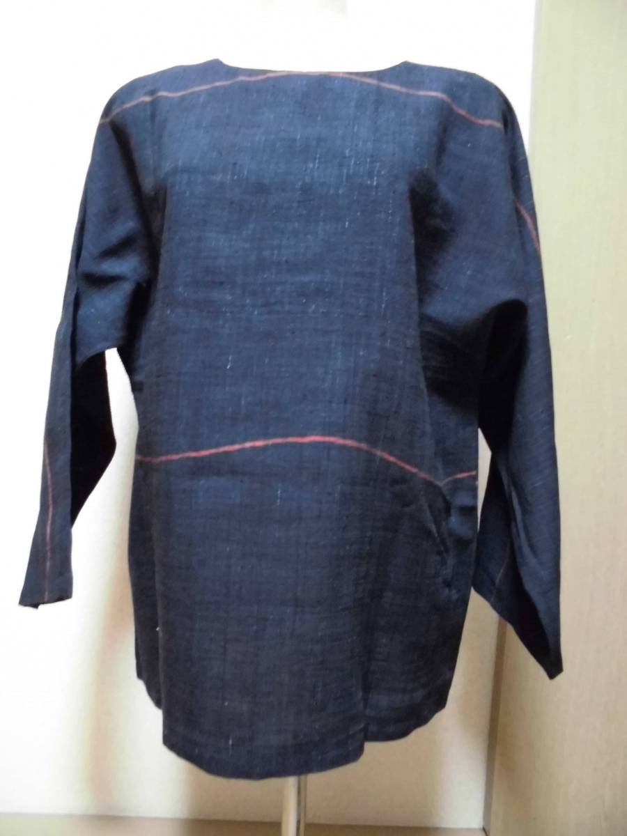 - ハンドメイド 着物リメイク・ブラウス紬紺②長袖/和服 手作り 絹 シルク レトロ アンティーク