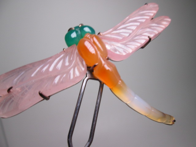 - 【江月】アンティーク・彫金緑石&紅水晶&瑪瑙の蜻蛉のかんざし 木箱付