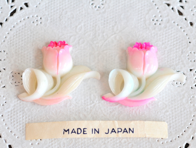 - ☆レア☆ ピンク チューリップ フラワー 花 ジャパン ヴィンテージ セルロイド カボション 日本製 レトロ ハンドメイド パーツ 小 2個