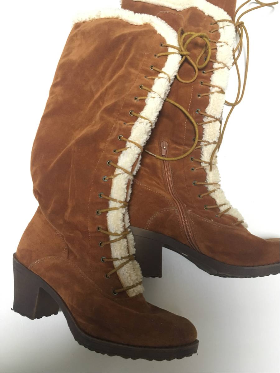 - 美品 スエード キャラメル 紐 リボン ロングブーツ R&E 冬、サンタ風