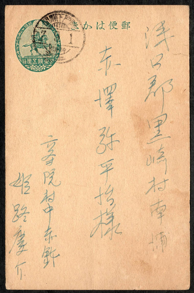 16430◆鉄郵印はがき 神戸下関間7.9.1上三★楠公1銭5厘 濁点なし 使用済
