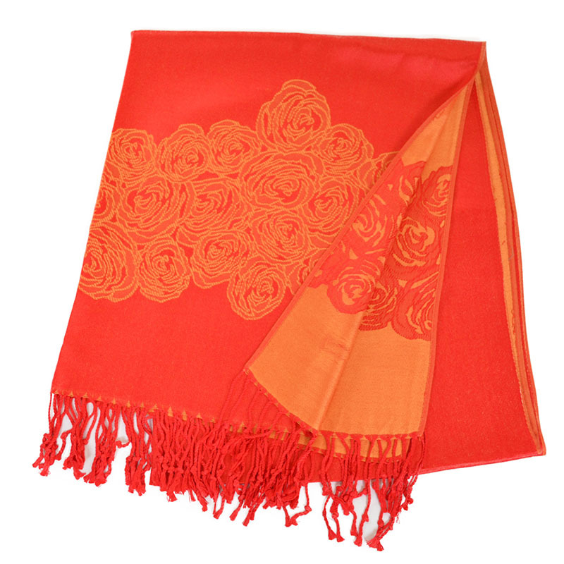 - ☆OUTLET☆ローズ花柄 刺繍入り リバーシブル 大判 ストール レッド&オレンジ