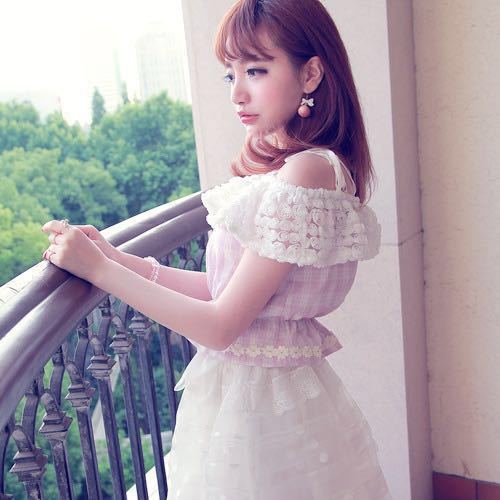 > Bobon21hiz/Jnorii☆ ギンガムチェック/薔薇フリルオフショル ♪パープル サイズ/S/レース/シャツ/かわいい トップス パステル/セクシー