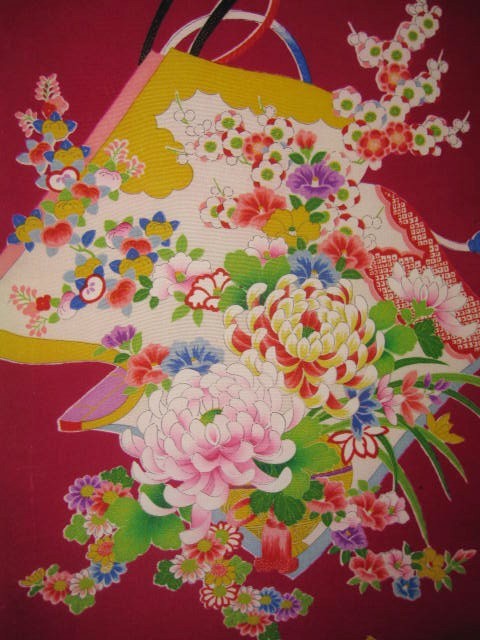 - 着物古布=11★濃い赤*古書*花車*鼓*牡丹*菊*椿*水仙*正絹*古布はぎれ★アンティーク